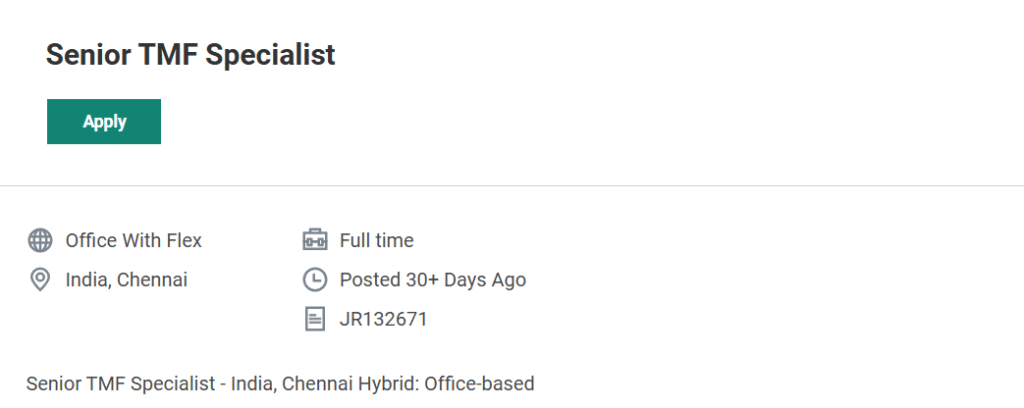 - In the search bar, type “Senior TMF Specialist – Chennai” or Job ID: JR132671.