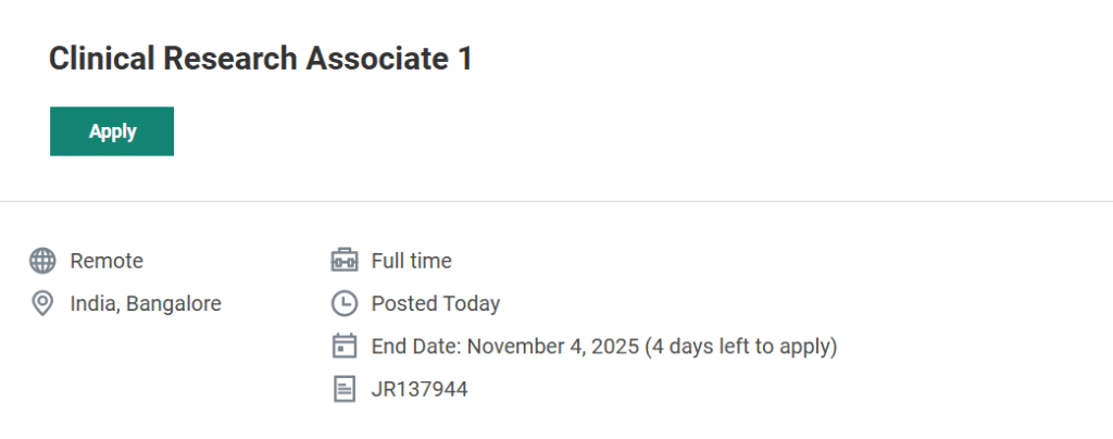 - Search for the role “Clinical Research Associate 1 – India (Remote)” using the job ID JR137944.