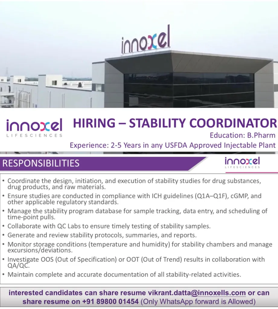 Interested candidates can apply via the following modes: Innoxel Lifesciences Hiring for Stability Coordinator