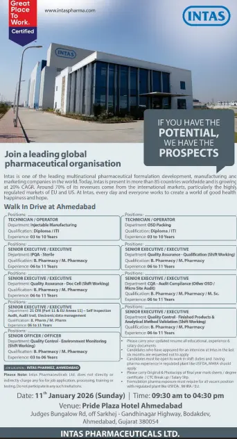 Certified as a Great Place to Work, Intas Pharmaceuticals follows a people-first culture and offers long-term career growth opportunities for professionals across manufacturing, quality, and compliance functions.