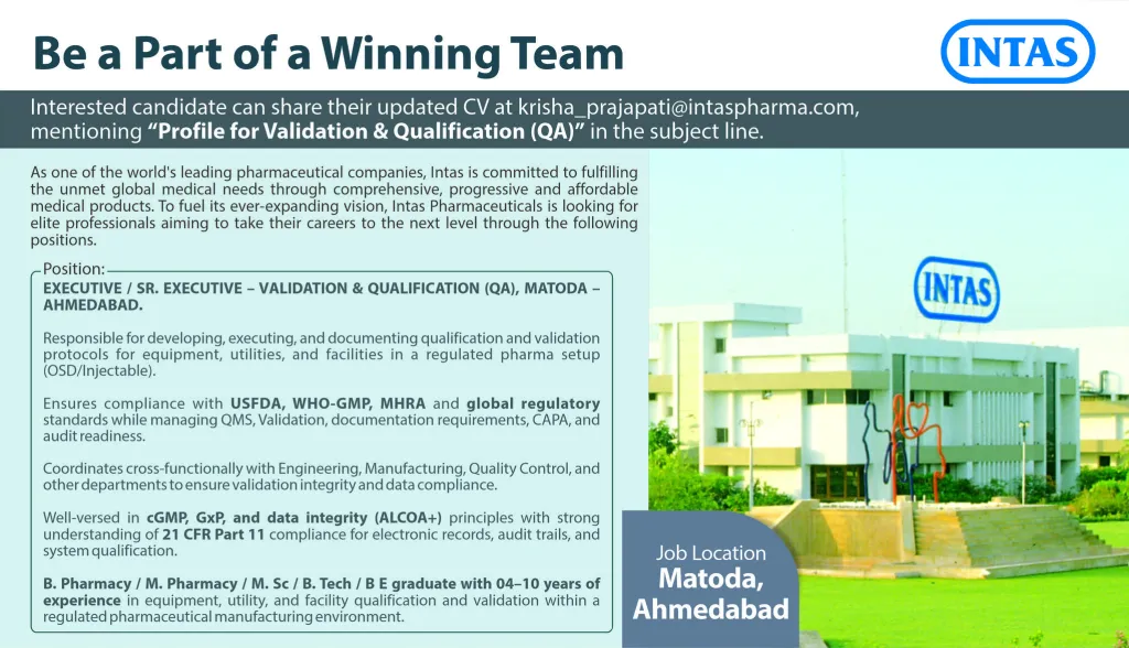 Interested candidates should send their CVs to krisha_prajapati@intaspharma.com with the subject line “Profile for Validation & Qualification (QA).”