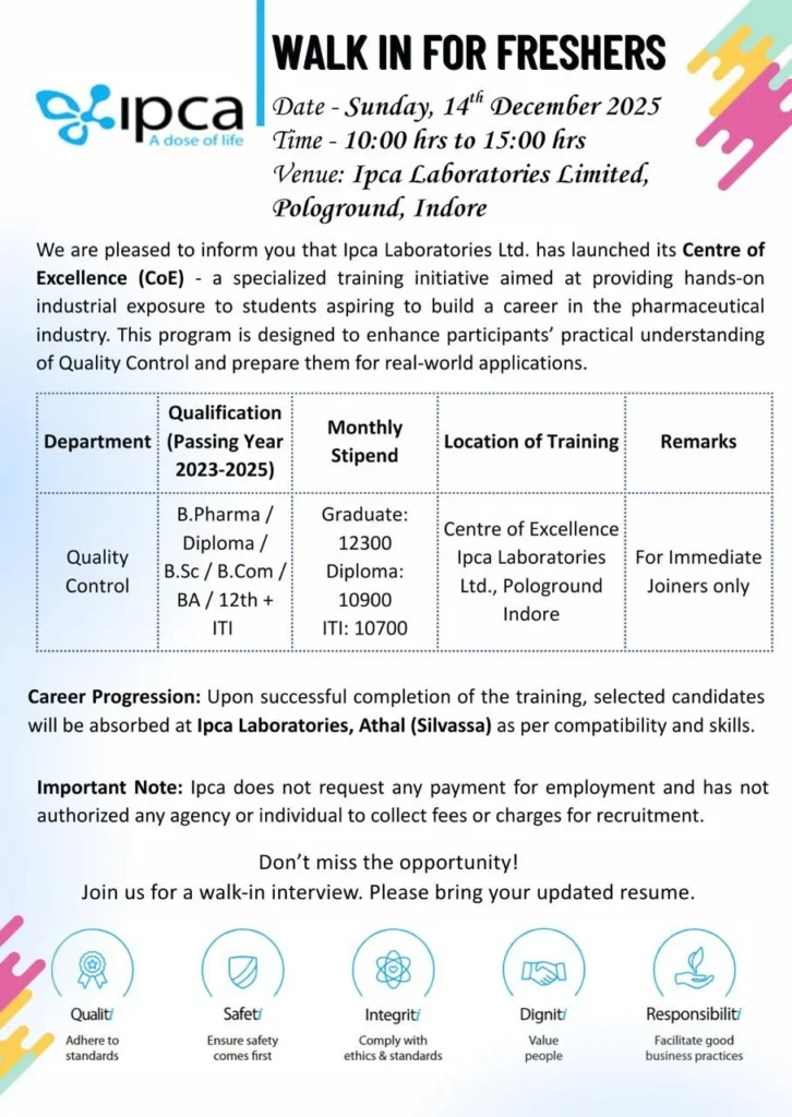Ipca Laboratories Ltd., a globally recognized pharmaceutical manufacturer, has announced an exclusive walk-in interview drive for freshers for the role of Trainee – Quality Control under its newly established Centre of Excellence (CoE). The event will be held on Sunday, 14th December 2025, at the company’s Pologround facility in Indore. This is an exceptional opportunity for students from multiple educational backgrounds to start a rewarding pharmaceutical career without any recruitment charges or hidden fees. Ipca Laboratories Freshers Hiring for QC Jobs