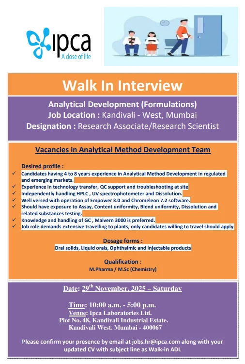 Ipca Laboratories Hiring for Analytical Development (Formulations) in Mumbai. Walk-in interview for M.Pharm and M.Sc professionals with 4–8 years experience.