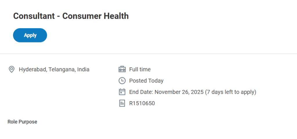 IQVIA, one of the world’s leading organizations in healthcare data, analytics, and technology-driven solutions, has announced a new vacancy for the role of Consultant – Consumer Health. This full-time position is based in Hyderabad, Telangana, and is ideal for professionals who have experience in analytics, consulting, or the Consumer Health/FMCG domain. The job posting has been published today, and interested candidates have time to apply until November 26, 2025. v