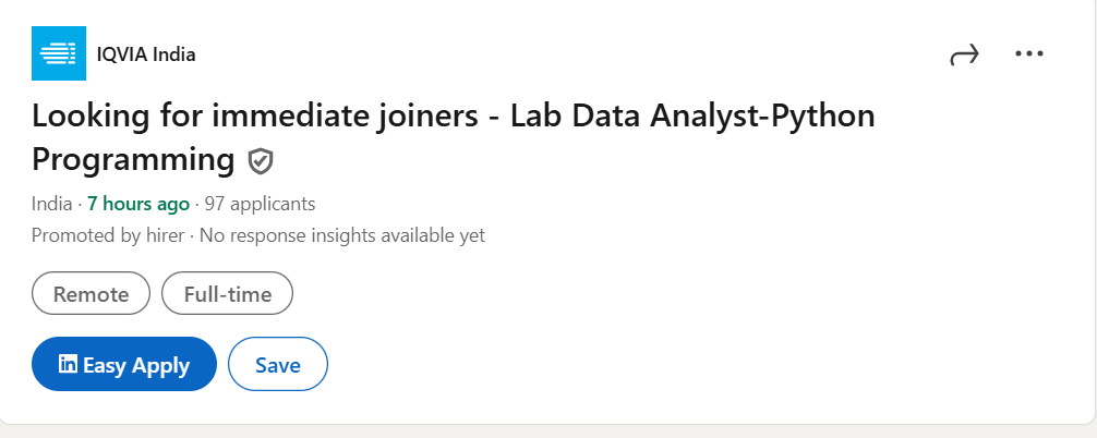 IQVIA Hiring for Lab Data Analyst with Python programming and data management skills across India. Apply now for this role.