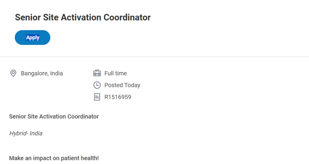 Eligible and interested candidates can apply directly through IQVIA’s careers portal by visiting the official website and searching for the Job ID R1516959. Candidates should ensure that their resume highlights relevant experience in clinical research, documentation, or site activation processes. After submitting the online application, shortlisted candidates will be contacted for further evaluation. IQVIA Hiring for Senior Site Activation Coordinator
