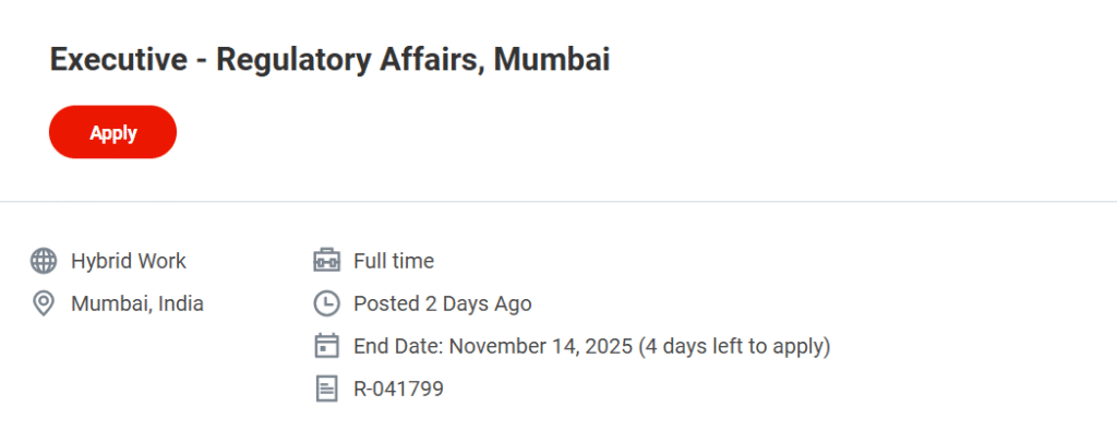 3. Click on “Apply Now” under the listing Executive – Regulatory Affairs, Mumbai (Hybrid Work).
