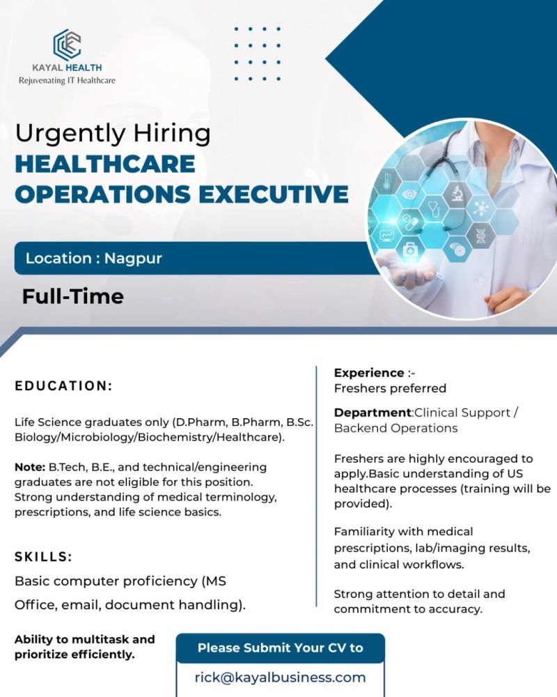 Kayal Health Hiring Freshers for Healthcare Operations Executive in Nagpur; life science graduates, US healthcare process training, email application.