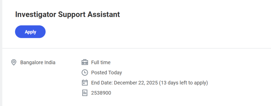 The position is currently open for applications, and the last date to apply is December 22, 2025, with 13 days remaining. This role is ideal for candidates interested in working in a global clinical operations environment, supporting investigator sites, maintaining operational documentation, and ensuring patient safety and regulatory compliance throughout study operations.