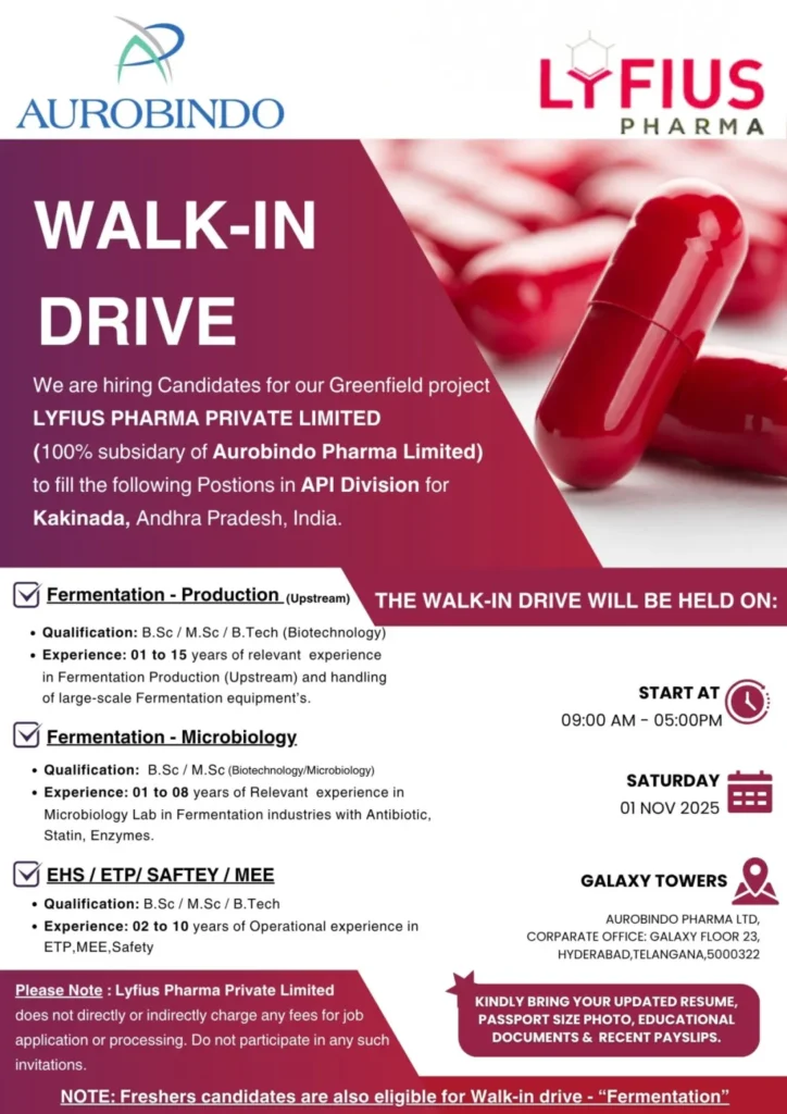 Lyfius Pharma Private Limited, a 100% subsidiary of Aurobindo Pharma Limited, is expanding its API Division for a greenfield project in Kakinada, Andhra Pradesh. The company is looking for talented professionals and freshers to join its team in Fermentation Production, Microbiology, and EHS/ETP/Safety/MEE departments.