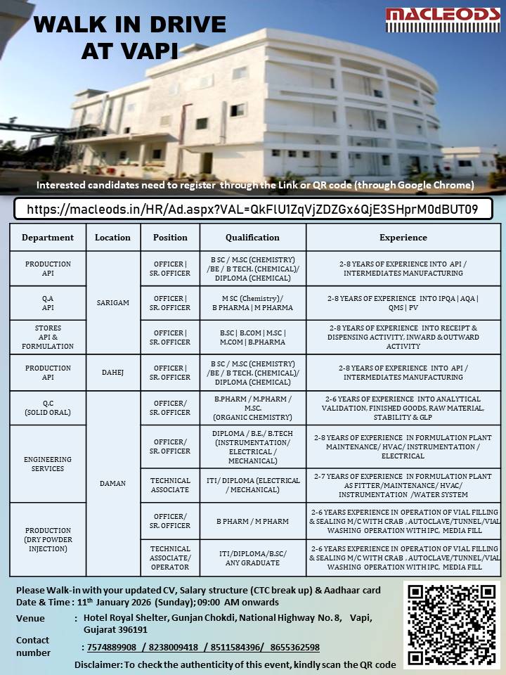 Macleods Pharmaceuticals is conducting a walk-in drive on Sunday, 11 January 2026 at Vapi, Gujarat to hire experienced professionals across Production, Quality Control, Engineering, and Stores departments for its Sarigam, Dahej, and Daman facilities. Macleods Pharmaceuticals Hiring Production QC Engineering