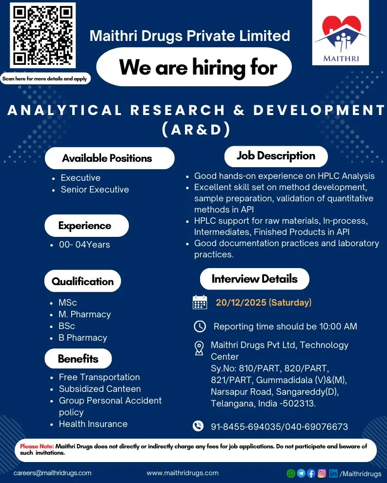 Maithri Drugs Private Limited does not charge any fees for recruitment, directly or indirectly. Candidates are advised to remain cautious of fraudulent job offers or invitations claiming to represent the company. Maithri Drugs Hiring Freshers for Analytical Research Development