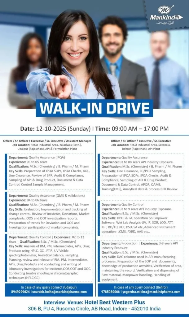 If you are unable to attend the walk-in, you can email your resume to: Mankind Pharma is Hiring for Production / QC / QA