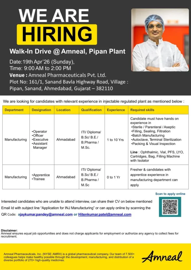 Amneal Pharma walk-in drive 2026 for manufacturing jobs in Ahmedabad. Freshers and experienced candidates eligible. Check salary, roles and apply now.