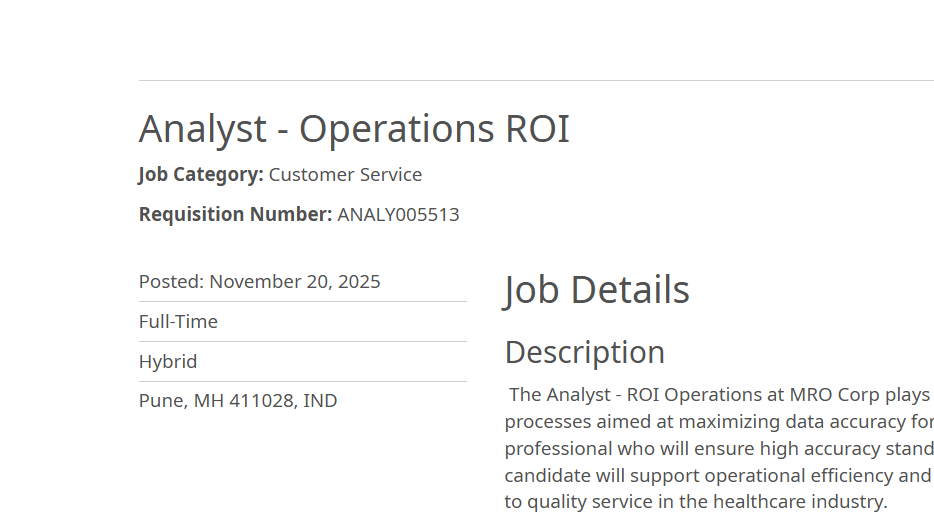The opening was posted on November 20, 2025, and invites applications from detail-oriented professionals who are passionate about healthcare operations, data integrity, and excellence in service performance. The Analyst – Operations ROI plays a pivotal role in supporting healthcare clients by ensuring the highest accuracy standards in data entry, analysis, and process efficiency. MRO Corp Hiring for Analyst Operations ROI