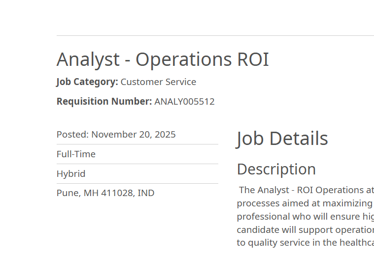The Analyst – ROI Operations position is designed for individuals with strong attention to detail, an analytical mindset, and a willingness to work in a fast-paced environment. The role focuses on healthcare data entry, validation, quality assurance, and process optimization—all essential components of modern healthcare operations. This comprehensive job post covers responsibilities, required skills, preferred background, performance expectations, and the application process to help candidates understand the opportunity in depth. MRO Corp Hiring for Analyst Operations ROI in Pune