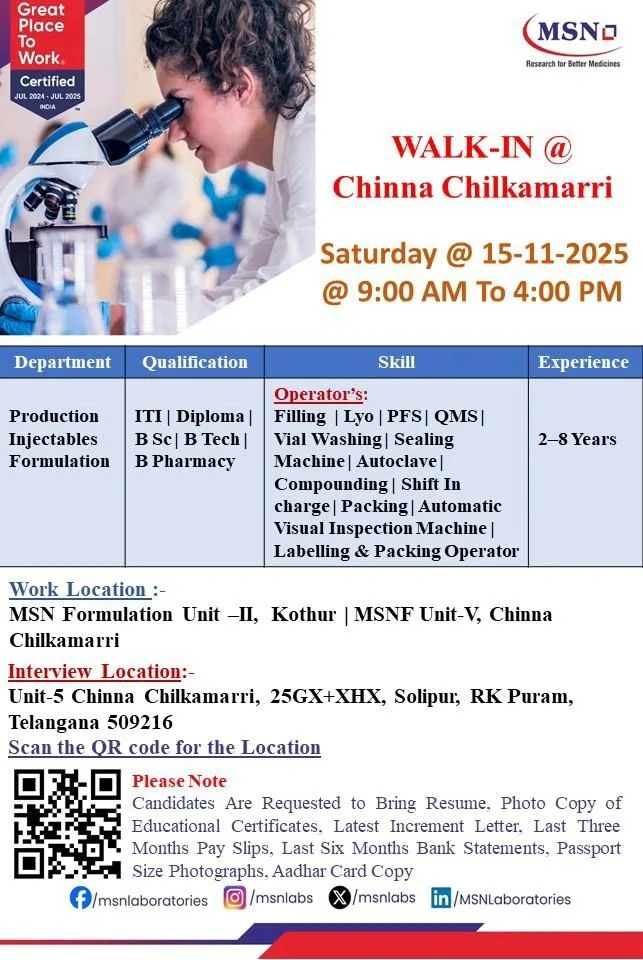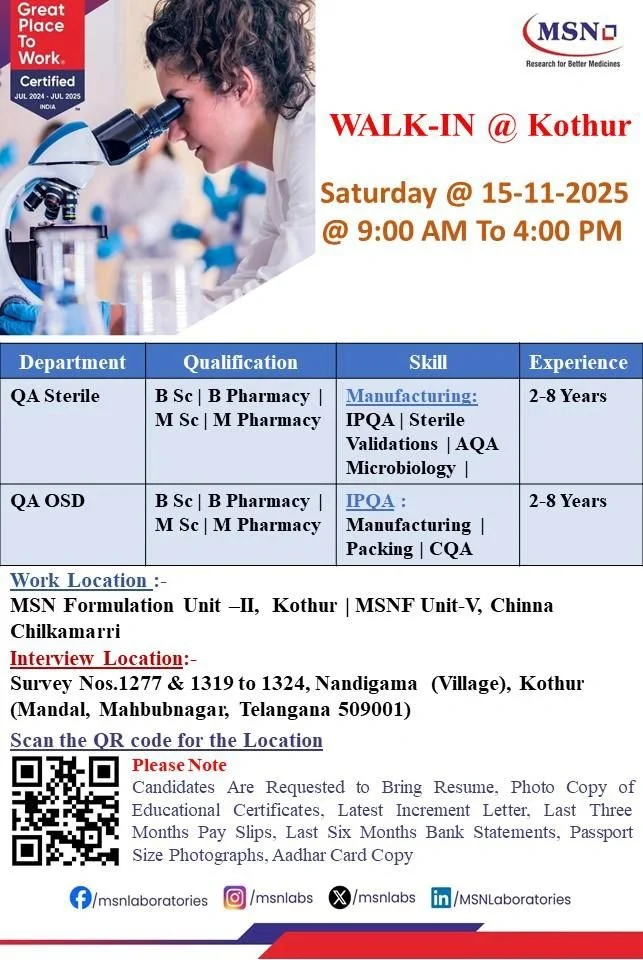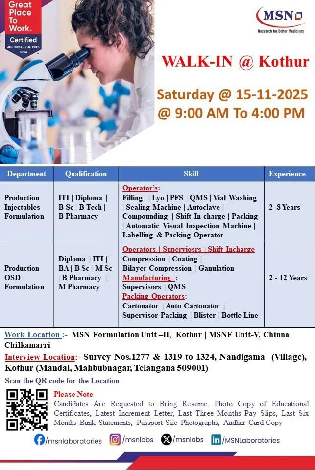 MSN Laboratories Hiring for Production / QC / QA / Microbiology roles. Attend walk-in interview on 15 November 2025 in Telangana.