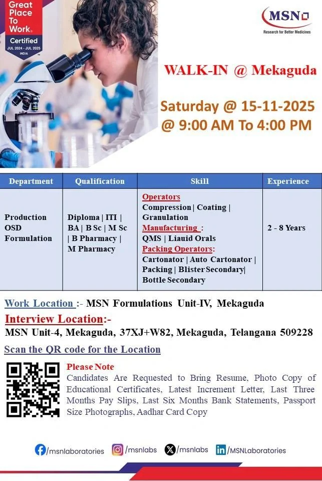 If you are ready for the next step in your professional journey, make sure to attend the walk-in interview on 15th November 2025 at one of the MSN units in Kothur, Mekaguda, or Chinna Chilkamarri. MSN Laboratories Hiring for Production / QC / QA / Microbiology