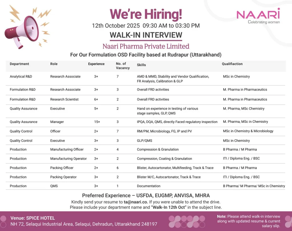 Naari Pharma Hiring for RD / QA / QC / Production jobs in Rudrapur. Attend walk-in interview on 12th October 2025.