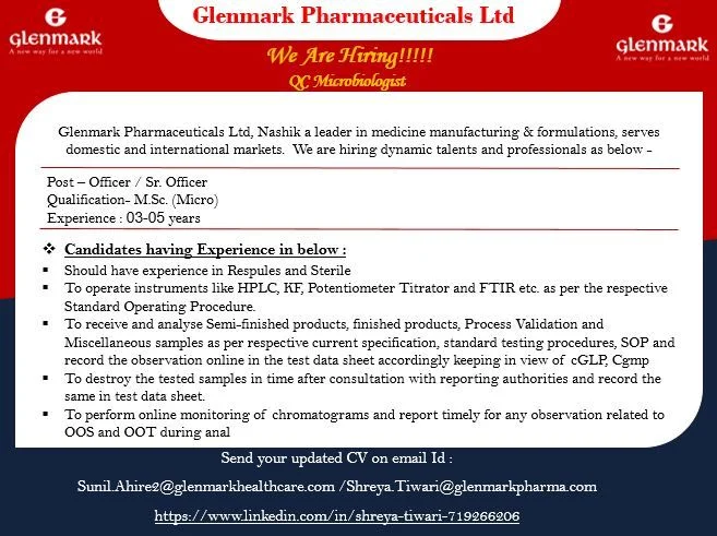 Choosing the Officer / Senior Officer โ QC Microbiologist at Glenmark Pharmaceuticals can significantly boost your career in pharma quality control. Hereโs why: