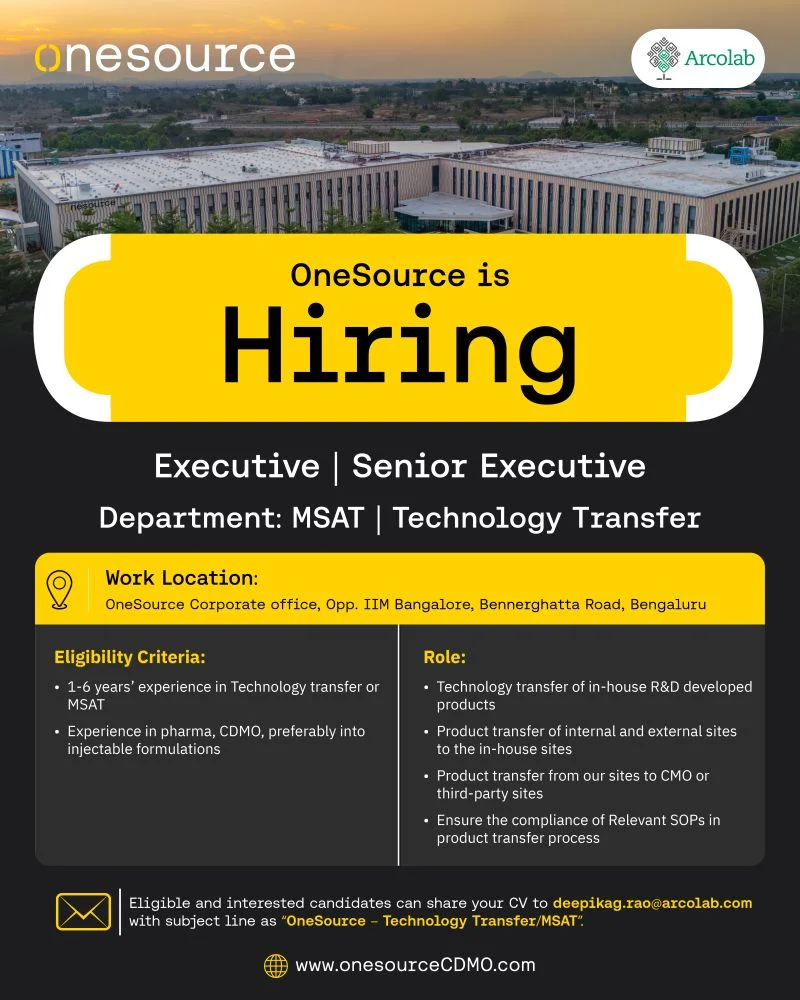 The Indian pharmaceutical and CDMO industry is witnessing rapid growth, especially in the field of sterile injectable manufacturing and complex drug development. One of the fastest-growing names in this segment, OneSource, the contract development and manufacturing arm of Arcolab, has announced a major recruitment drive for MSAT & Technology Transfer professionals at its corporate office in Bengaluru.