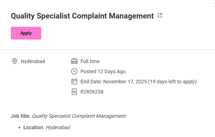 The Quality Specialist – Complaint Management position at Opella Healthcare, Hyderabad, offers an excellent opportunity for experienced pharma professionals to manage and improve product complaint processes in line with global GMP and quality standards. Opella Pharma Hiring for Quality Specialist