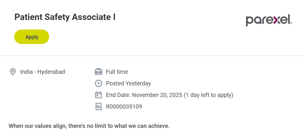 The position was posted recently, and the last date to apply is November 20, 2025, giving applicants limited time to complete their applications. Candidates who are passionate about improving patient outcomes, supporting clinical trials, and maintaining compliance with global regulatory requirements will find this role an ideal entry point into the world of pharmacovigilance and clinical research. Parexel Hiring for Patient Safety Associate I