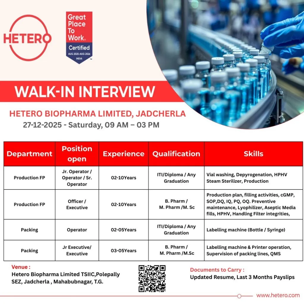 Hetero Biopharma Limited, a Great Place to Work Certified organization and part of the reputed Hetero Group, is conducting a walk-in interview for Production (Finished Products) and Packing roles at its state-of-the-art injectable manufacturing facility in Jadcherla, Telangana. Production Packing Jobs for Freshers
