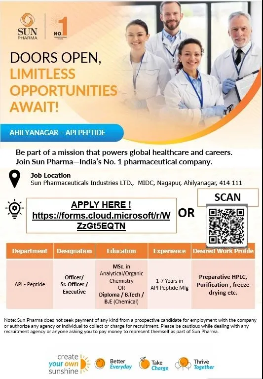 Sun Pharma Production Peptide job 2026 hiring for API roles. Check eligibility, salary, experience, and apply online today quickly.