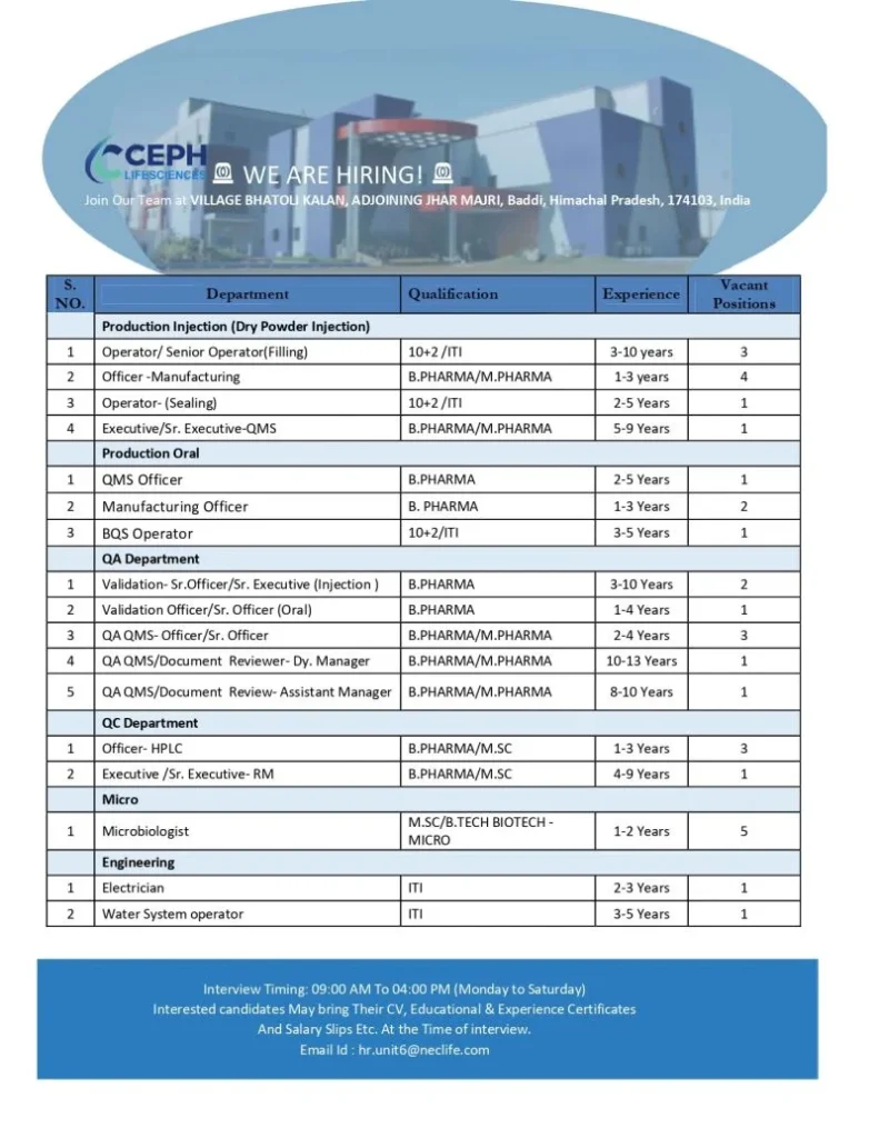 All positions are based at CEPH Lifesciences, Baddi, Himachal Pradesh.