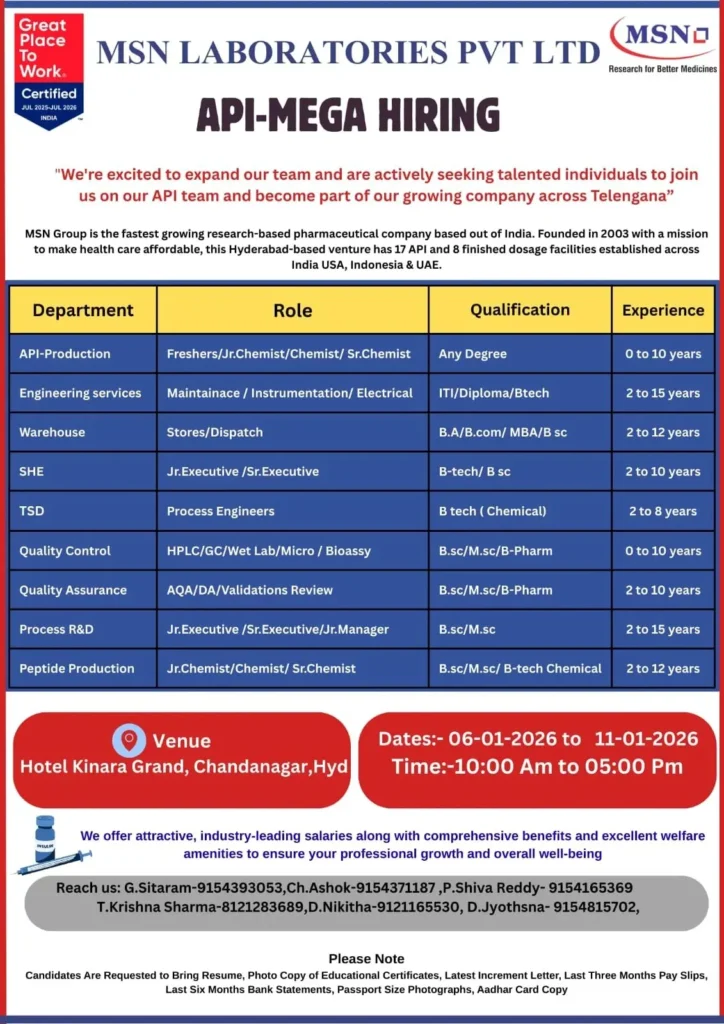 MSN Laboratories Pvt. Ltd. has announced a mega walk-in hiring drive in Hyderabad for its Active Pharmaceutical Ingredient (API) manufacturing and research operations. This recruitment drive is open to freshers and experienced professionals across multiple departments including API Production, Quality Control, Quality Assurance, Process R&D, Engineering Services, Warehouse & Stores, SHE, Technical Services & Development, and Peptide Production. Production QC QA RD Jobs in Hyderabad