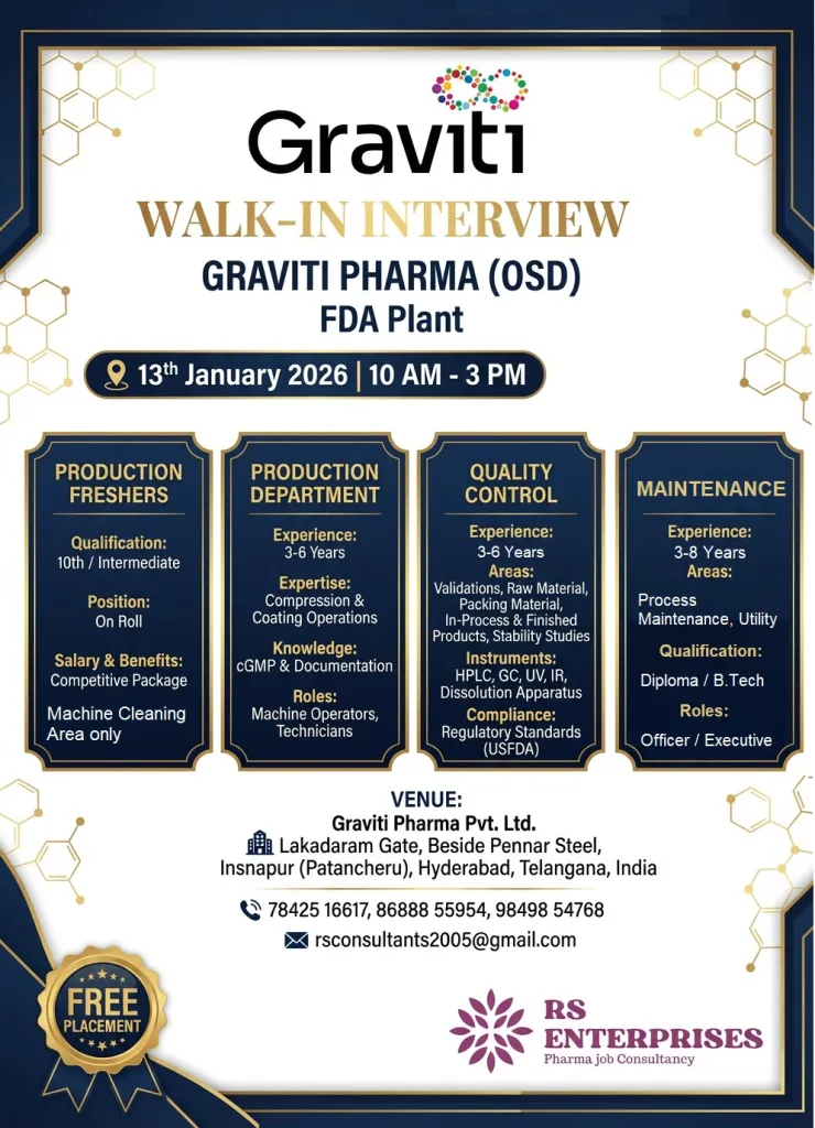 Graviti Pharma is conducting a walk-in interview for multiple roles across Production, Quality Control, and Maintenance departments. This hiring drive is open to both freshers and experienced professionals who are looking to work in a regulated pharmaceutical manufacturing environment. Production Quality Control Maintenance Jobs