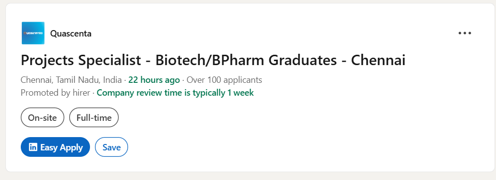 Projects Specialist job at Quascenta for BPharm and Biotech freshers. Check eligibility, salary, skills, and apply online today quickly.
