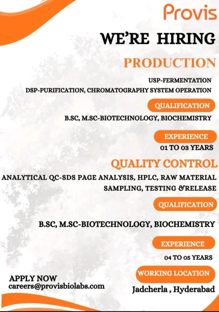 Provis Biolabs Hiring for Production / Quality Control biotech jobs in Hyderabad. Apply by November 10, 2025 via email.