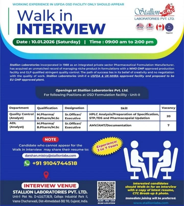 Stallion Laboratories Pvt. Ltd. is a well-established pharmaceutical formulation manufacturer with approvals from USFDA, UK MHRA, and WHO-GMP. The company operates advanced Oral Solid Dosage (OSD) manufacturing facilities and is known for strong compliance, robust quality systems, and regulatory excellence. QC Analyst ADL Analyst Jobs at Stallion Laboratories