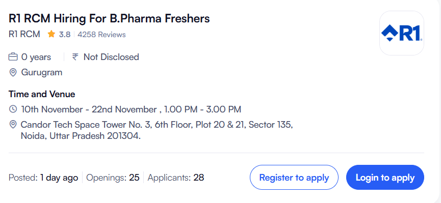 If you are a B.Pharma or M.Pharma fresher looking to start your professional journey in the healthcare and business process management sector, then R1 RCM is offering an excellent opportunity for you. The company is conducting walk-in interviews from 10th November to 22nd November 2025 for B.Pharma freshers to join their team in Gurugram. R1 RCM Hiring for BPharma Freshers