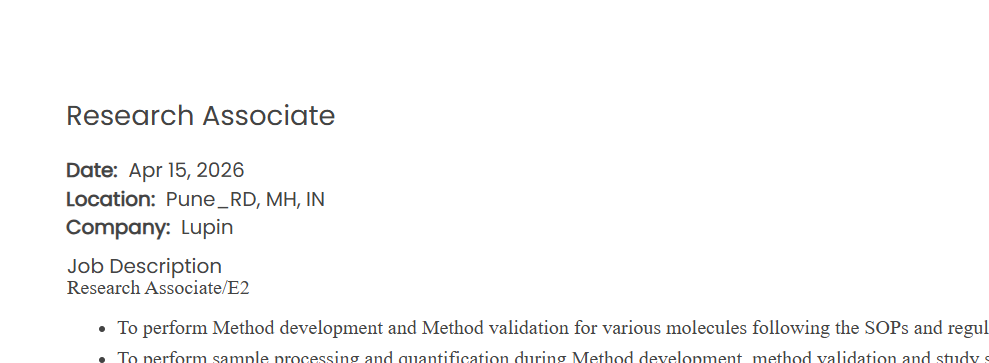 Apply for Research Associate at Lupin Pune. Check eligibility analytical chemistry experience responsibilities salary details and apply online for pharma job today.