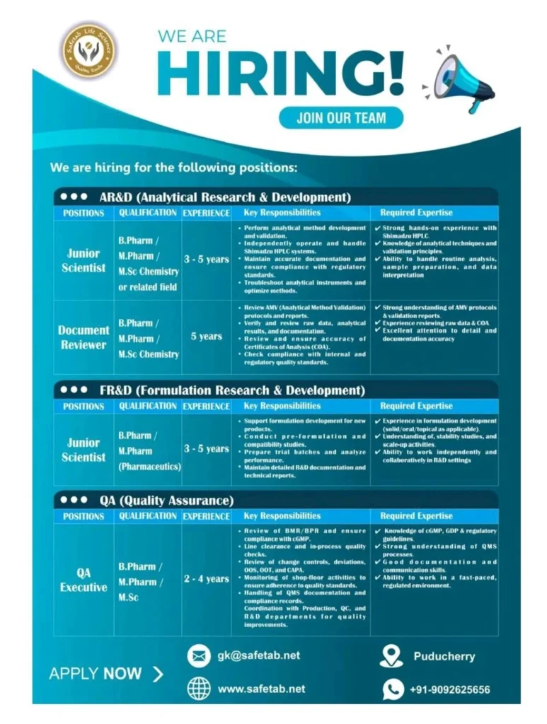 Safetab Life Science, one of the fastest-growing pharmaceutical companies in Puducherry, has officially announced multiple job vacancies for the year 2025 in its Analytical Research & Development (AR&D), Formulation Research & Development (FR&D), and Quality Assurance (QA) departments. These openings present an excellent career opportunity for qualified and experienced professionals holding B.Pharm, M.Pharm, or M.Sc (Chemistry/Pharmaceutics) degrees who are looking to advance their careers in a regulated pharmaceutical environment. Safetab Life Science Hiring for RD / FRD / QA