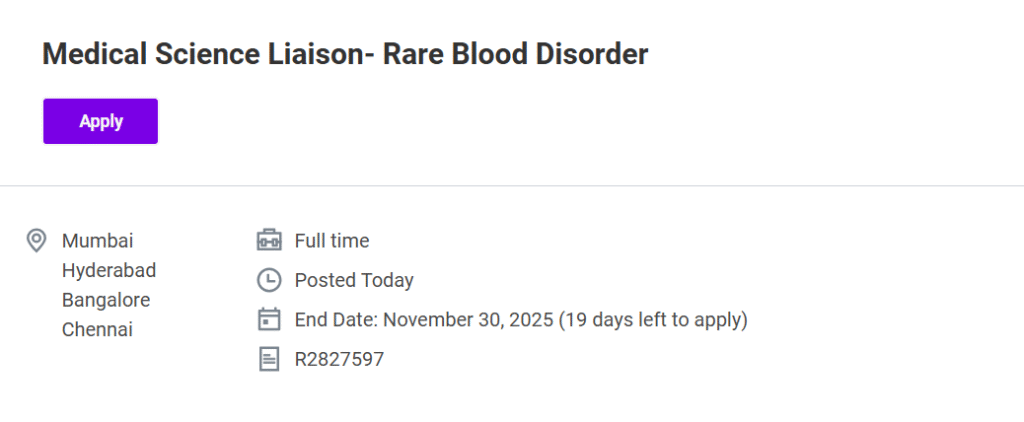 The MSL – Rare Blood Disorder will play a critical role in Sanofi’s mission to improve lives through better science and innovation. The position is open in multiple key cities including Mumbai, Hyderabad, Bangalore, Chennai, and Delhi, providing opportunities for professionals across India to join Sanofi’s expanding medical team. Sanofi Hiring for Medical Science Liaison Rare Blood Disorder