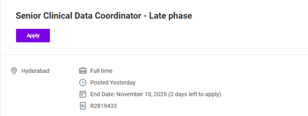 - Search for the Job ID R2819433 or the title Senior Clinical Data Coordinator – Late Phase.