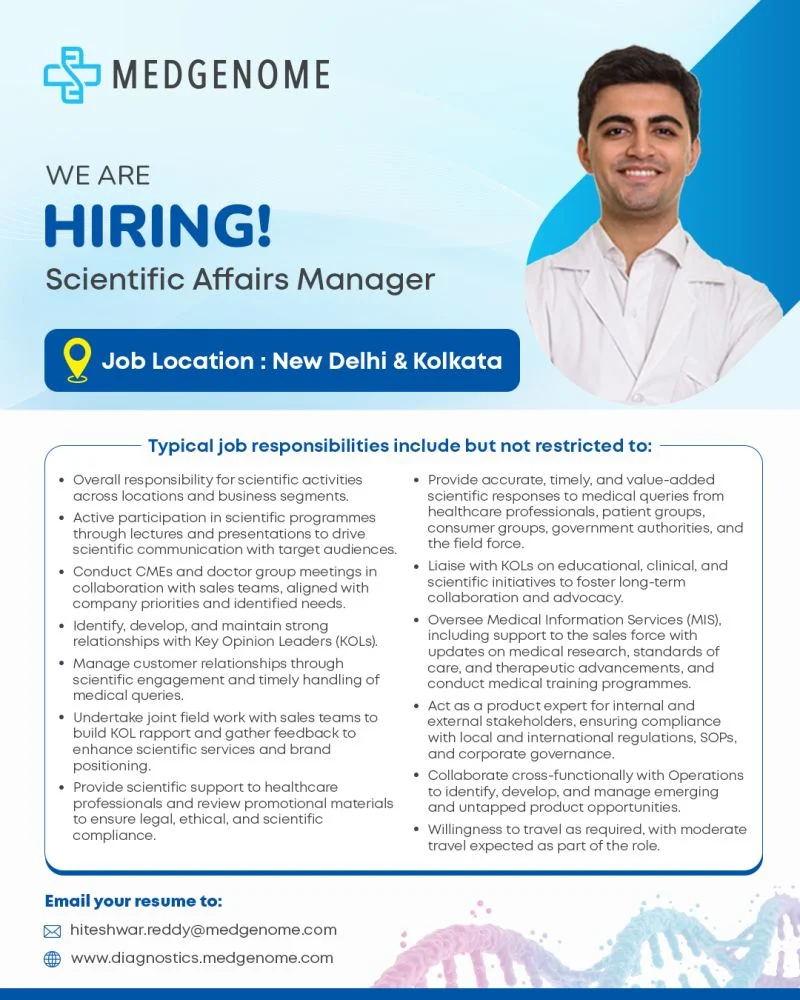 The Scientific Affairs Manager at MedGenome plays a critical role in bridging scientific knowledge, clinical practice, and business objectives. This position focuses on scientific communication, medical engagement, and collaboration with healthcare professionals, KOLs, and internal teams to strengthen MedGenomeโs leadership in genomics-based diagnostics.
