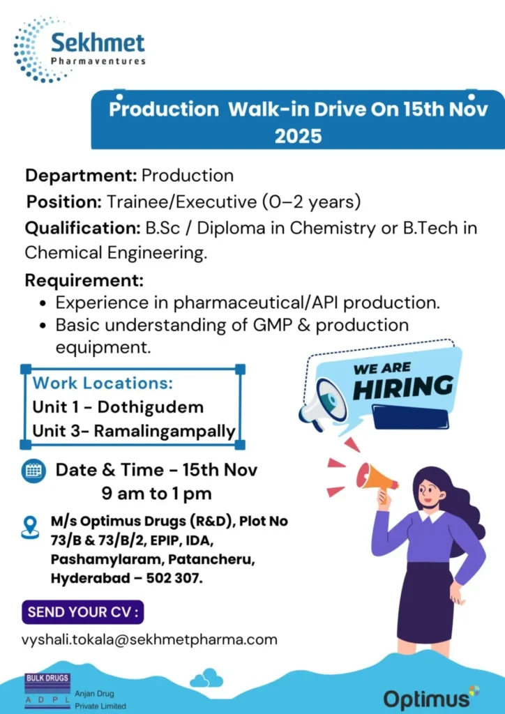 This is a verified and genuine walk-in opportunity for aspiring professionals in the pharmaceutical sector. Sekhmet Pharmaventures’ production trainee and executive roles in Hyderabad offer the perfect platform to start your journey in API manufacturing. If you have the educational background, enthusiasm, and commitment to learn, attend the walk-in drive on 15th November 2025 and take your first step toward a rewarding pharma career. Sekhmet Pharma Hiring for Production Trainee / Executive