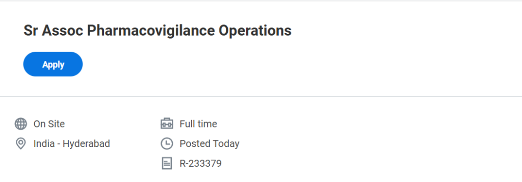 Amgen is hiring for the position of Senior Associate โ Pharmacovigilance Operations in Hyderabad, India. This is a full-time, on-site opportunity within the Medical Services career category, designed for experienced pharmacovigilance professionals with strong expertise in global safety reporting, ICSR processing, and regulatory compliance.