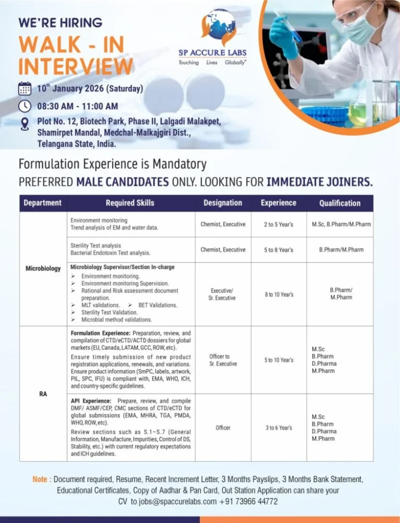 SP Accure Labs is conducting a walk-in interview on Saturday, 10 January 2026, to hire experienced professionals for Microbiology and Regulatory Affairs departments. Candidates with mandatory formulation experience and the ability to join immediately are strongly preferred. SP Accure Labs Hiring Microbiology Regulatory Affairs Jobs