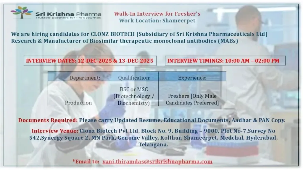 Sri Krishna Pharmaceuticals Ltd., through its biotechnology subsidiary Clonz Biotech Pvt. Ltd., has announced a freshers-only walk-in interview for the Production Department at its advanced biopharmaceutical manufacturing facility in Genome Valley, Hyderabad. Sri Krishna Pharmaceuticals Hiring Freshers for Production