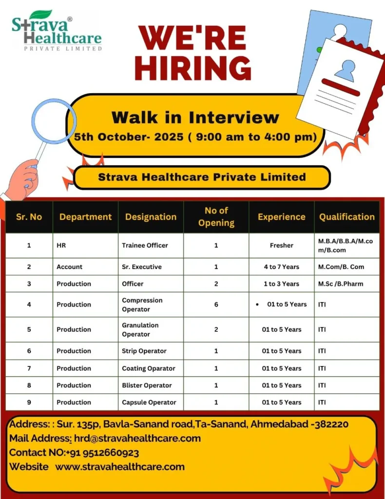If you are looking for a rewarding career in the pharmaceutical industry, Strava Healthcare Pvt. Ltd. is the right place to start or grow your journey. With positions open across HR, Accounts, Production, and Operator roles, this is an excellent opportunity to work with one of the leading pharma companies in Gujarat. Strava Healthcare Hiring freshers HR / Accounts