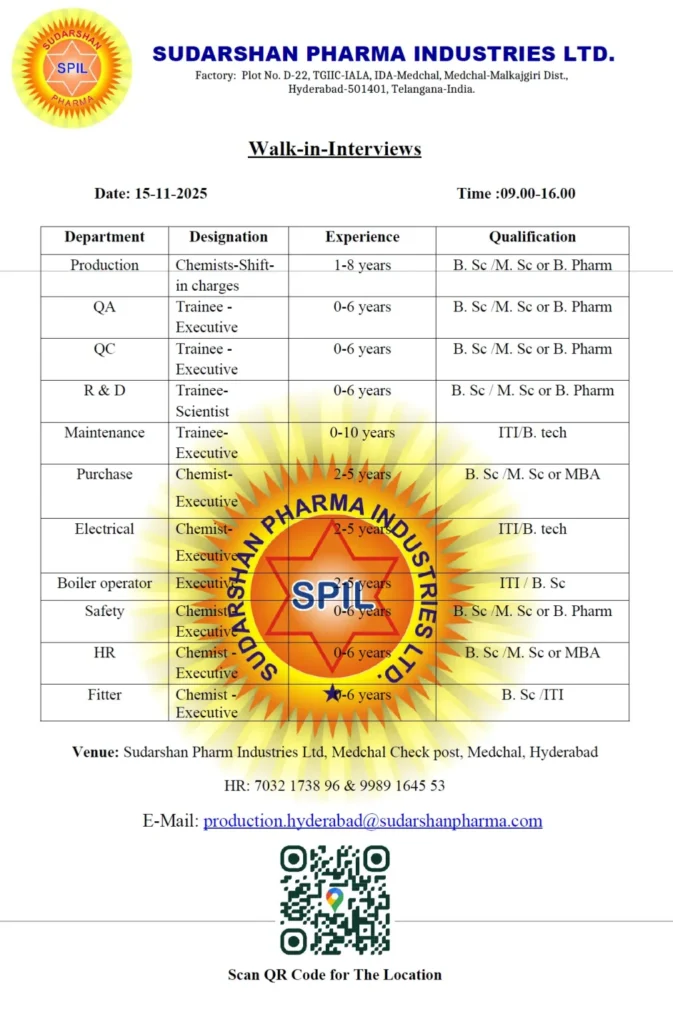 Candidates can scan the QR code available in the official advertisement for the exact location or use Google Maps by searching Sudarshan Pharma Industries Medchal Hyderabad.