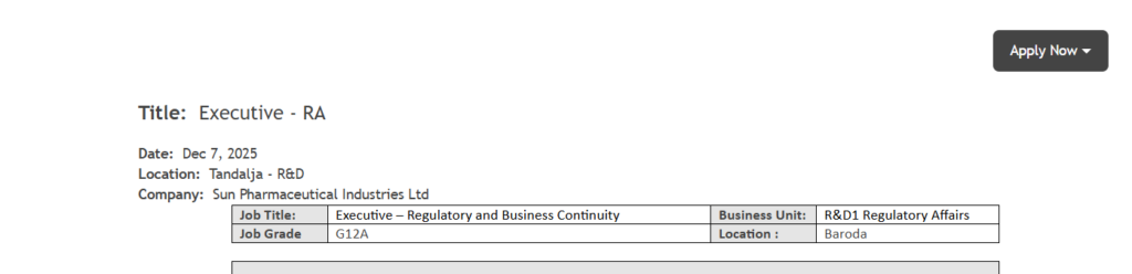 Interested and eligible candidates can apply through the official Sun Pharmaceutical Industries Ltd career portal. Candidates are advised to: Sun Pharma Hiring for Executive Regulatory Affairs RD
