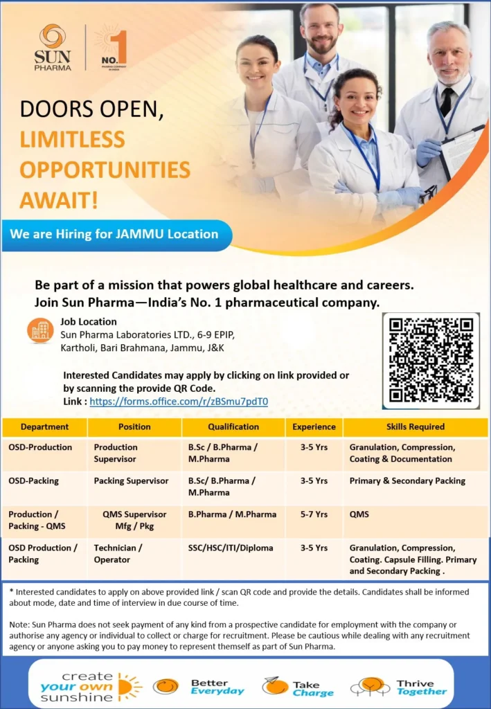 Sun Pharma is seeking skilled and motivated professionals to join its growing team at the Jammu facility. If you have the required qualifications and are ready to advance your pharmaceutical career, apply today and be part of a globally recognized organization known for innovation, integrity, and excellence. Sun Pharma Hiring for Production / Packing