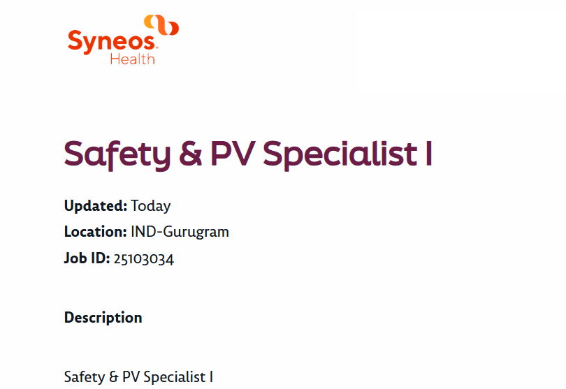 👉 https://www.syneoshealth.com - Navigate to the Careers section and search for Job ID: 25103034 or the title “Safety & PV Specialist I – India”.